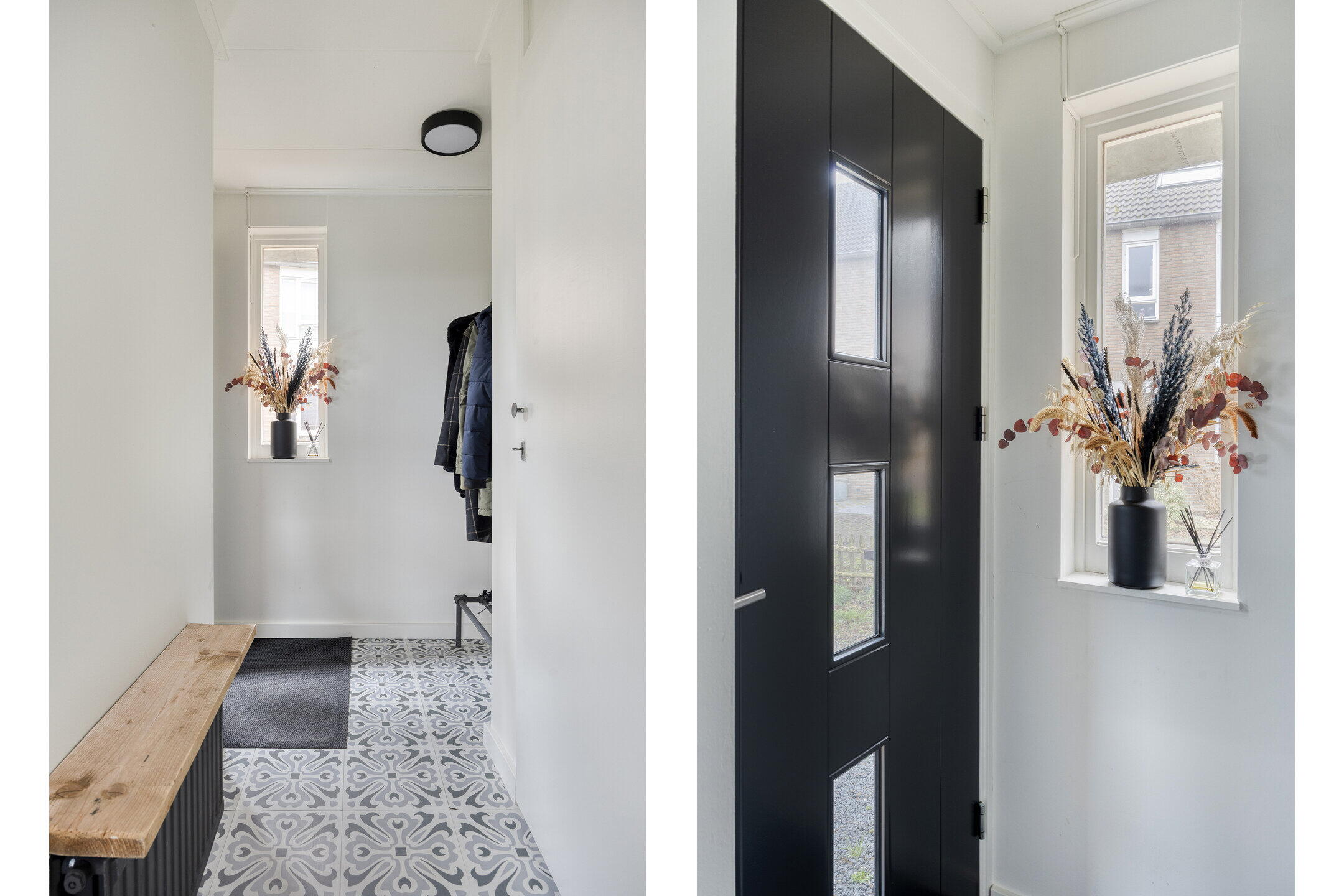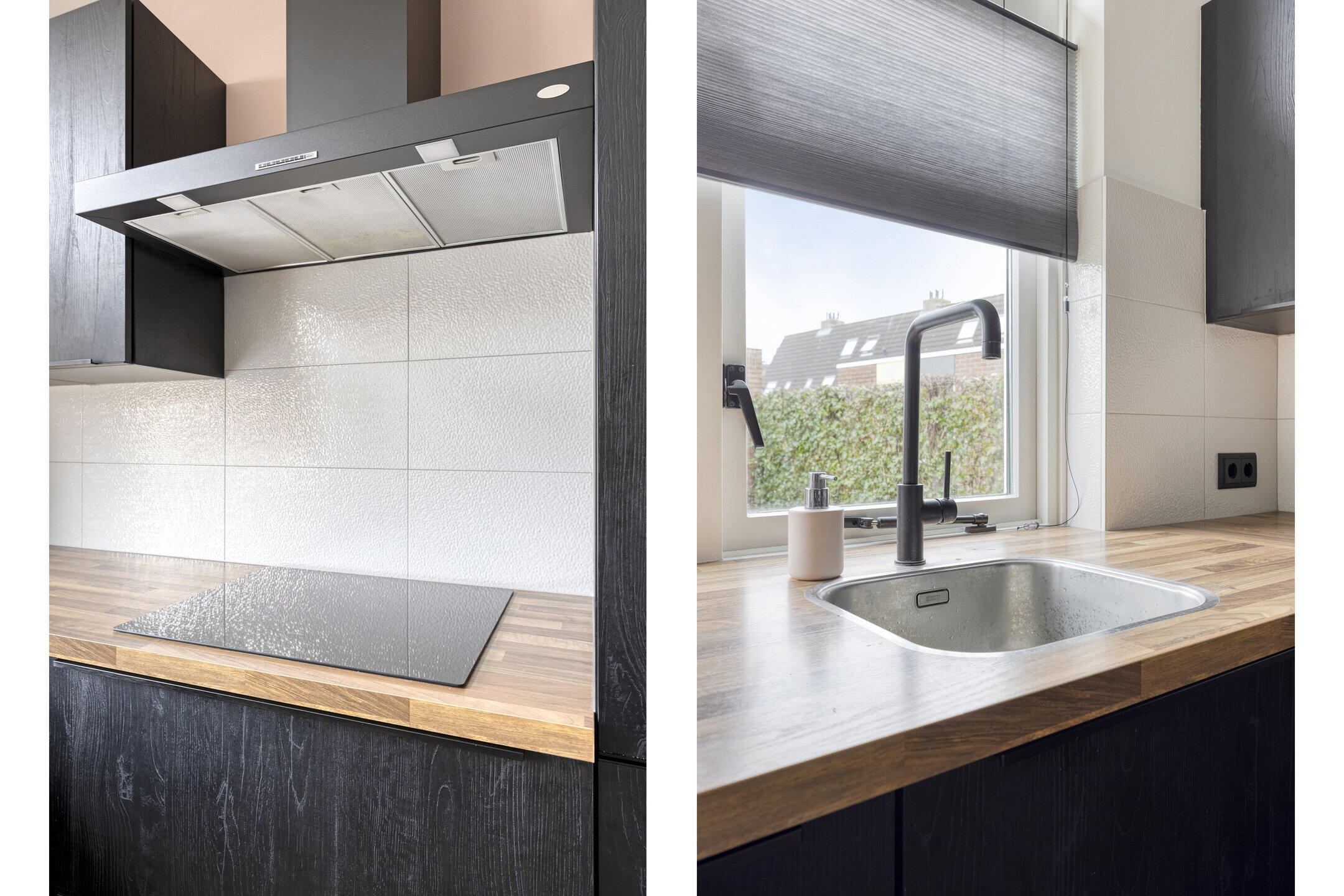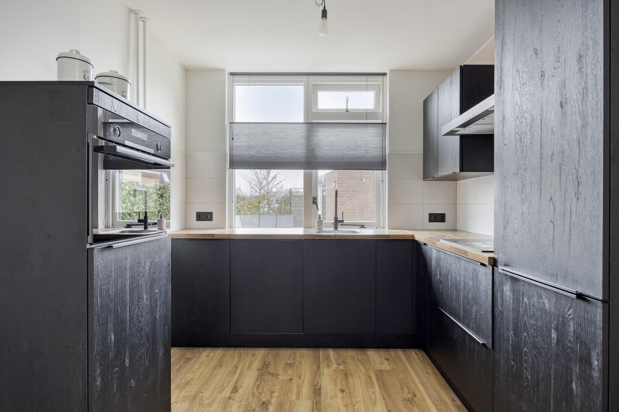 Entree, hal met garderobe en meterkast. De woonkamer is sfeervol en licht, mede dankzij het extra zijraam. De warme kleurstelling, de laminaatvloer (2020) en de praktische voorraad-/trapkast zorgen voor een prettige en functionele leefruimte. De open keuken is uitgevoerd in modern zwart met een houtkleurig werkblad en beschikt over alle benodigde inbouwapparatuur: inductiekookplaat, afzuigkap, combi magnetron, koelkast, vriezer en vaatwasser. Het raam in de keuken zorgt voor veel daglicht en een fijn zicht op de tuin. Achterportaal met toilet, trapopgang en toegang tot de tuin.