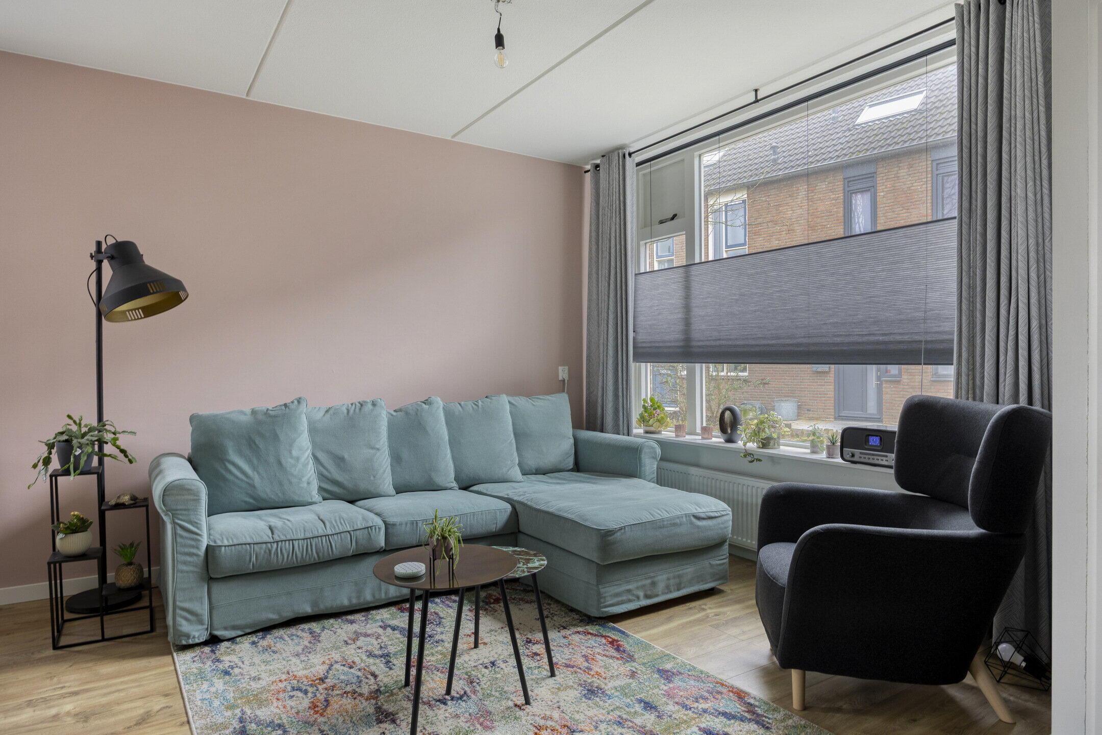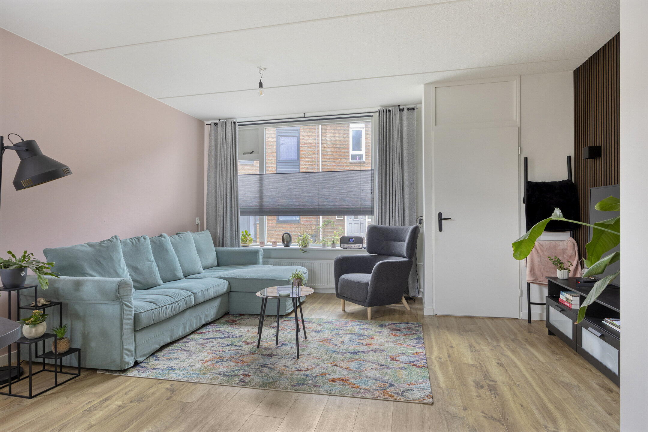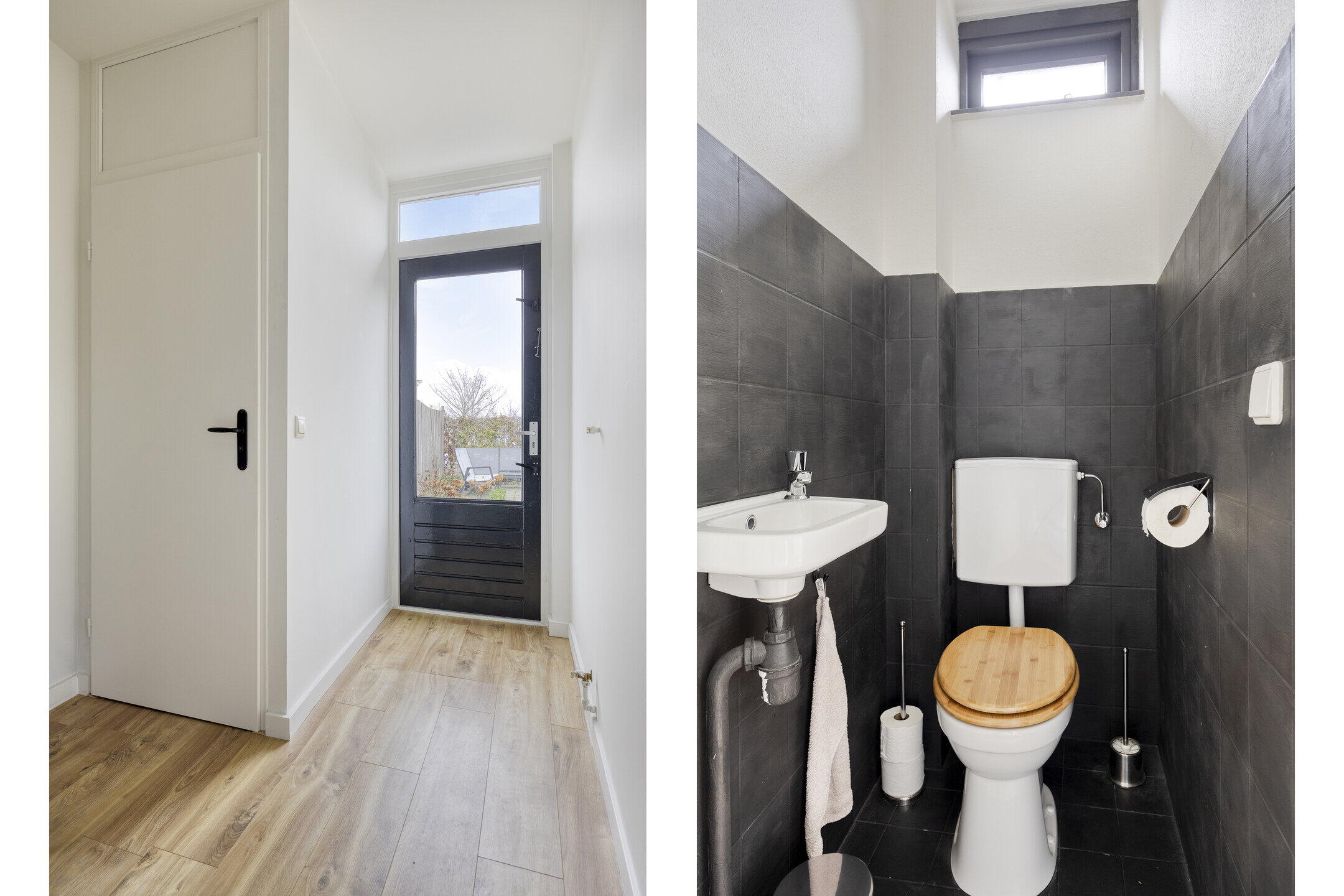 Entree, hal met garderobe en meterkast. De woonkamer is sfeervol en licht, mede dankzij het extra zijraam. De warme kleurstelling, de laminaatvloer (2020) en de praktische voorraad-/trapkast zorgen voor een prettige en functionele leefruimte. De open keuken is uitgevoerd in modern zwart met een houtkleurig werkblad en beschikt over alle benodigde inbouwapparatuur: inductiekookplaat, afzuigkap, combi magnetron, koelkast, vriezer en vaatwasser. Het raam in de keuken zorgt voor veel daglicht en een fijn zicht op de tuin. Achterportaal met toilet, trapopgang en toegang tot de tuin.