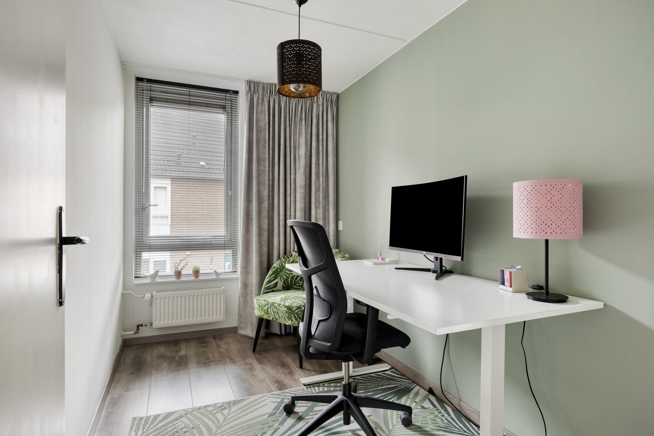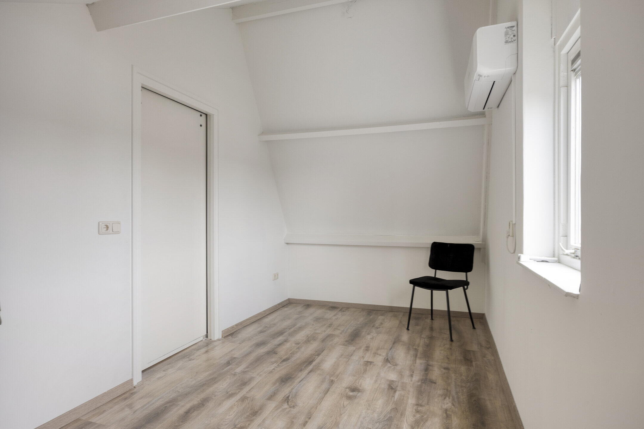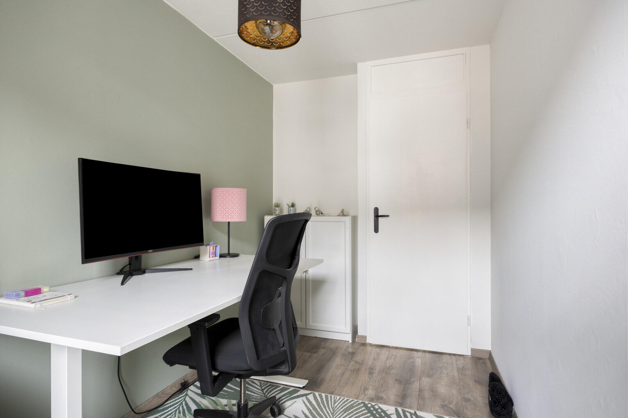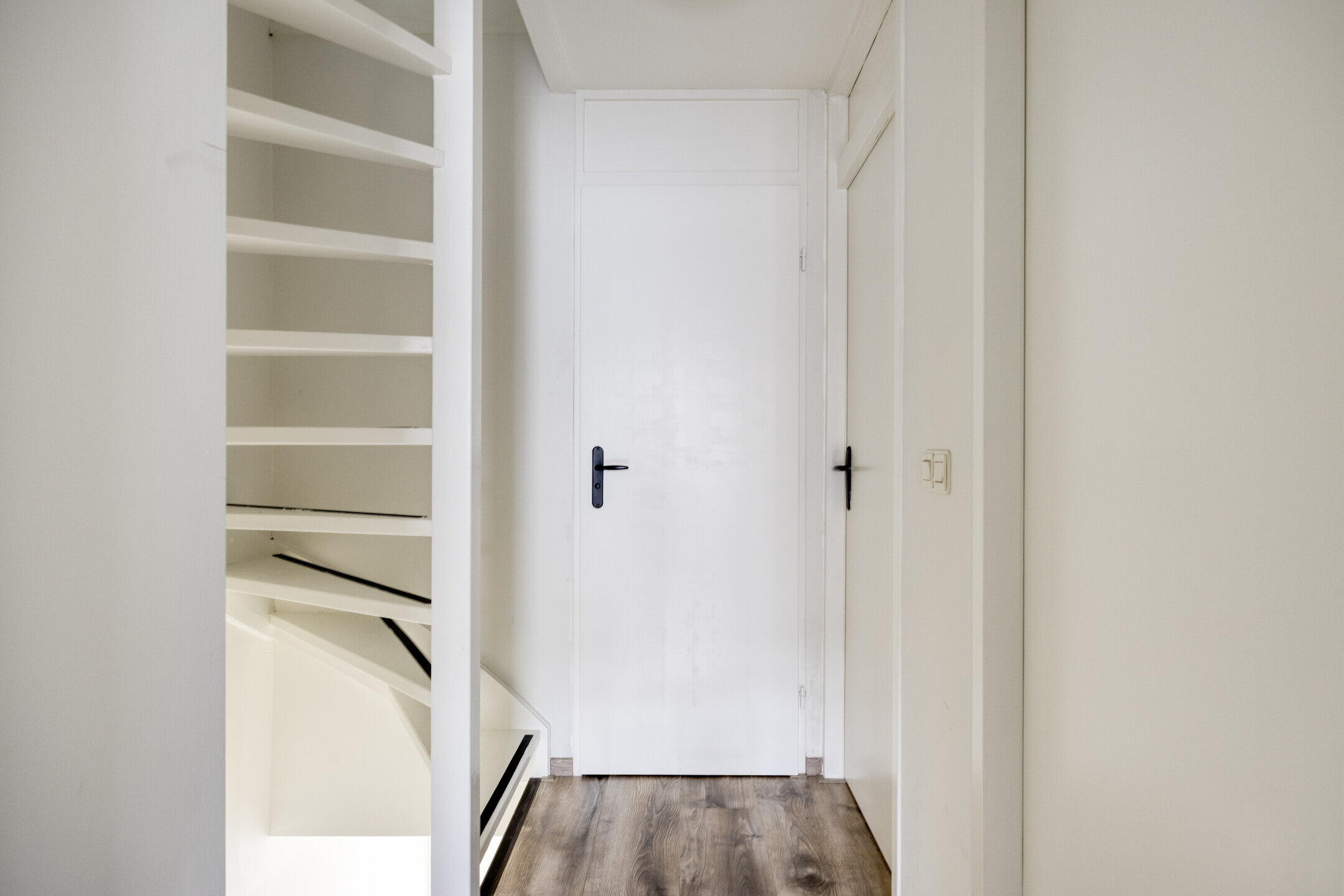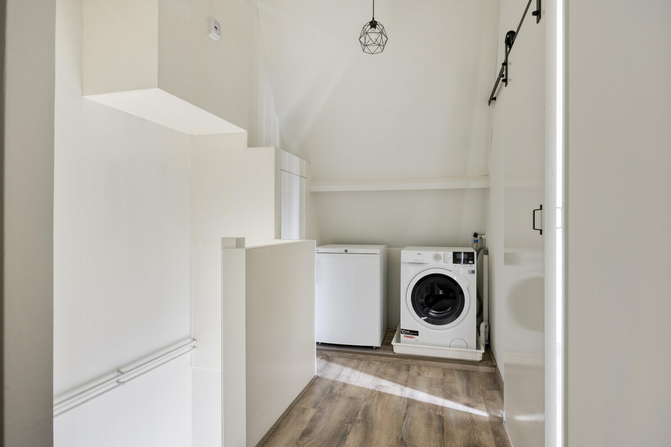 Via een vaste trap bereik je de praktische voorzolder met opstelling van wasmachine, droger, cv-ketel (Intergas, 2014, eigendom) en extra bergruimte. Aansluitend bevindt zich de vierde slaapkamer, voorzien van een laminaatvloer en airco.