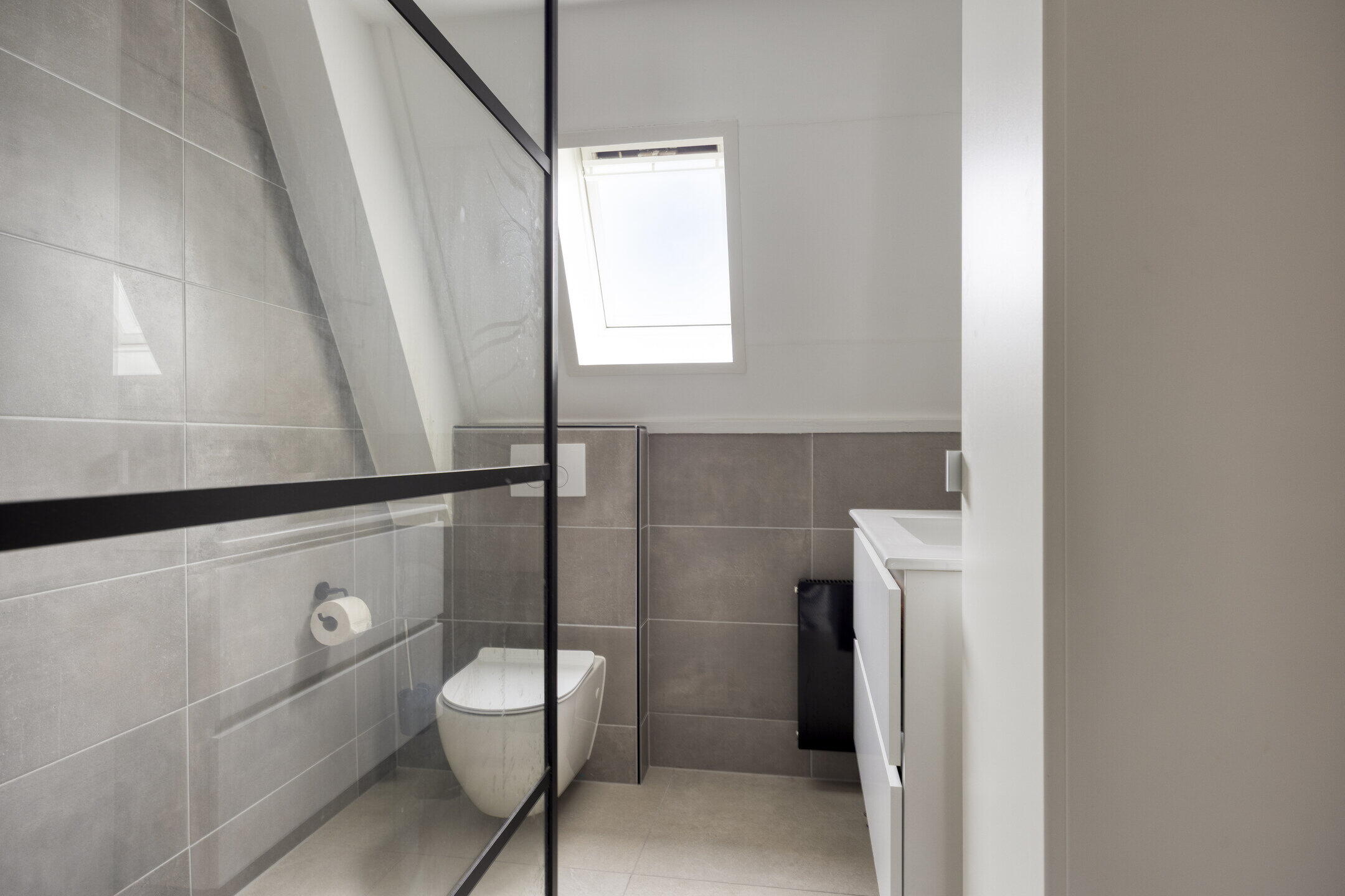 Overloop met toegang tot drie ruime slaapkamers, alle voorzien van laminaatvloeren. De badkamer is modern uitgevoerd en voorzien van een inloopdouche, tweede toilet, wastafelmeubel, zwarte kranen en een dakraam voor natuurlijke ventilatie en daglicht.